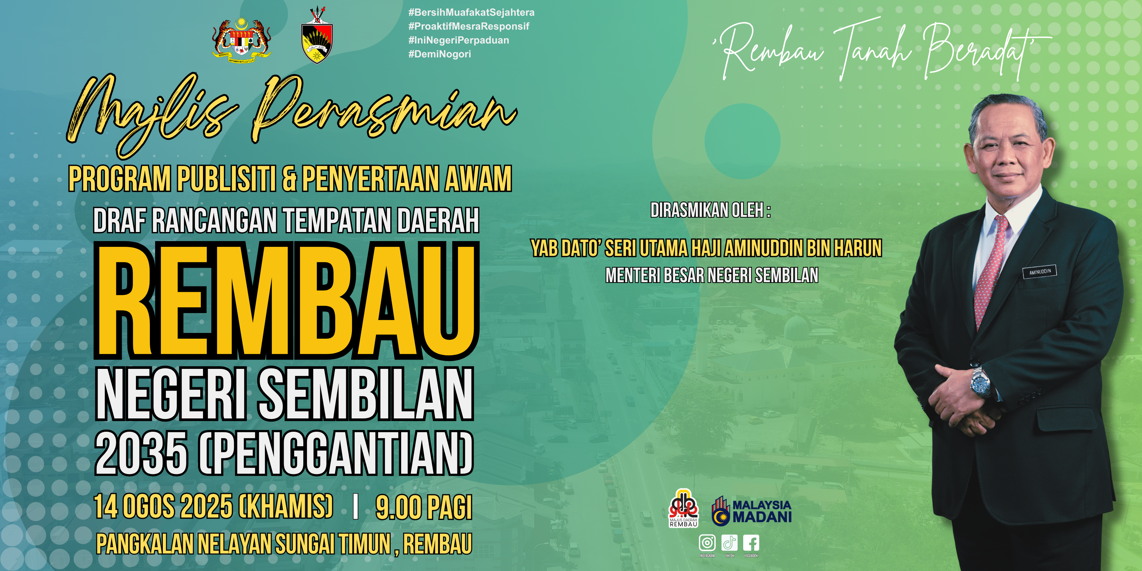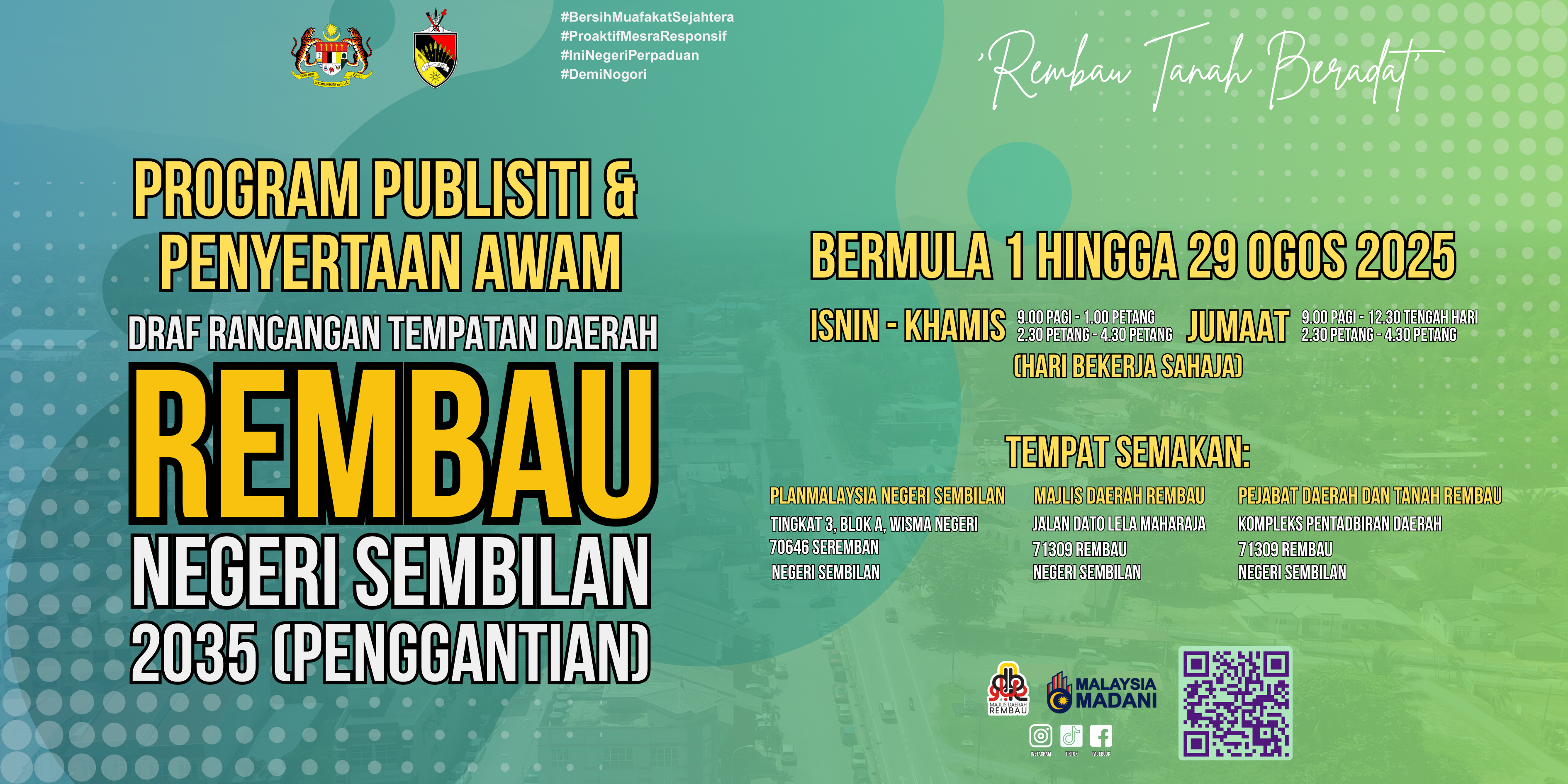 Program Publisiti dan Penyertaan Awam Draf Rancangan Tempatan Daerah Rembau Negeri Sembilan 2035 (Penggantian) akan diadakan bermula pada 01 Ogos 2025 – 29 Ogos 2025. Semua pihak dijemput untuk mengemukakan idea, pendapat, cadangan atau bantahan kepada urus setia sepertimana yang dinyatakan di dalam Borang Maklum Balas Awam sebelum atau pada 29 Ogos 2025 (Jumaat).