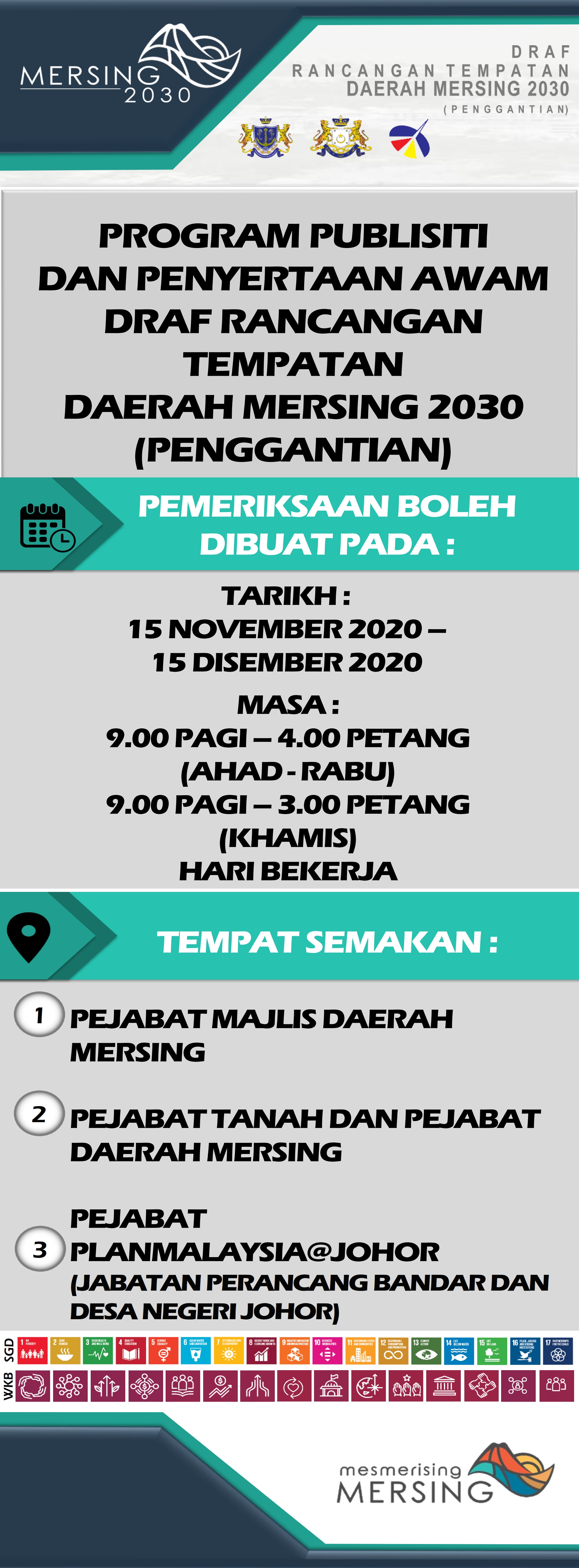 Rancangan Tempatan (RT) merupakan satu dokumen yang disediakan selaras dengan peruntukan seksyen 12, Akta Perancangan Bandar dan Desa 1976 (Akta 172). Menurut peruntukan di bawah Akta Perancangan Bandar dan Desa 1976 (Akta 172), pengubahan, pembatalan dan penggantian rancangan tempatan telah dinyatakan mengikut peruntukan yang ditetapkan di dalam Subseksyen 16 (1) dan Subseksyen 16 (2). RT Daerah Mersing 2030 (Penggantian) disediakan untuk menggantikan RT Daerah Mersing 2018 yang telah tamat tempoh perancangannya. Matlamat Pembangunan RTD Mersing 2030 (Penggantian) ialah “MERSING DAERAH HIJAU YANG SEJAHTERA DAN LESTARI DENGAN FOKUS SEBAGAI DESTINASI PELANCONGAN BERTARAF ANTARABANGSA” Dan tagline visi pembangunan ialah ‘KE ARAH BANDAR MERSING BANDAR PELANCONGAN YANG BERSIH, INDAH DAN MENAWAN (mesmerizing Mersing)’. |