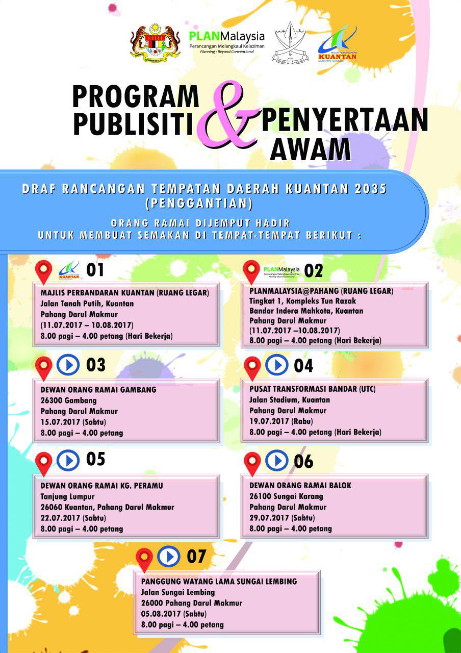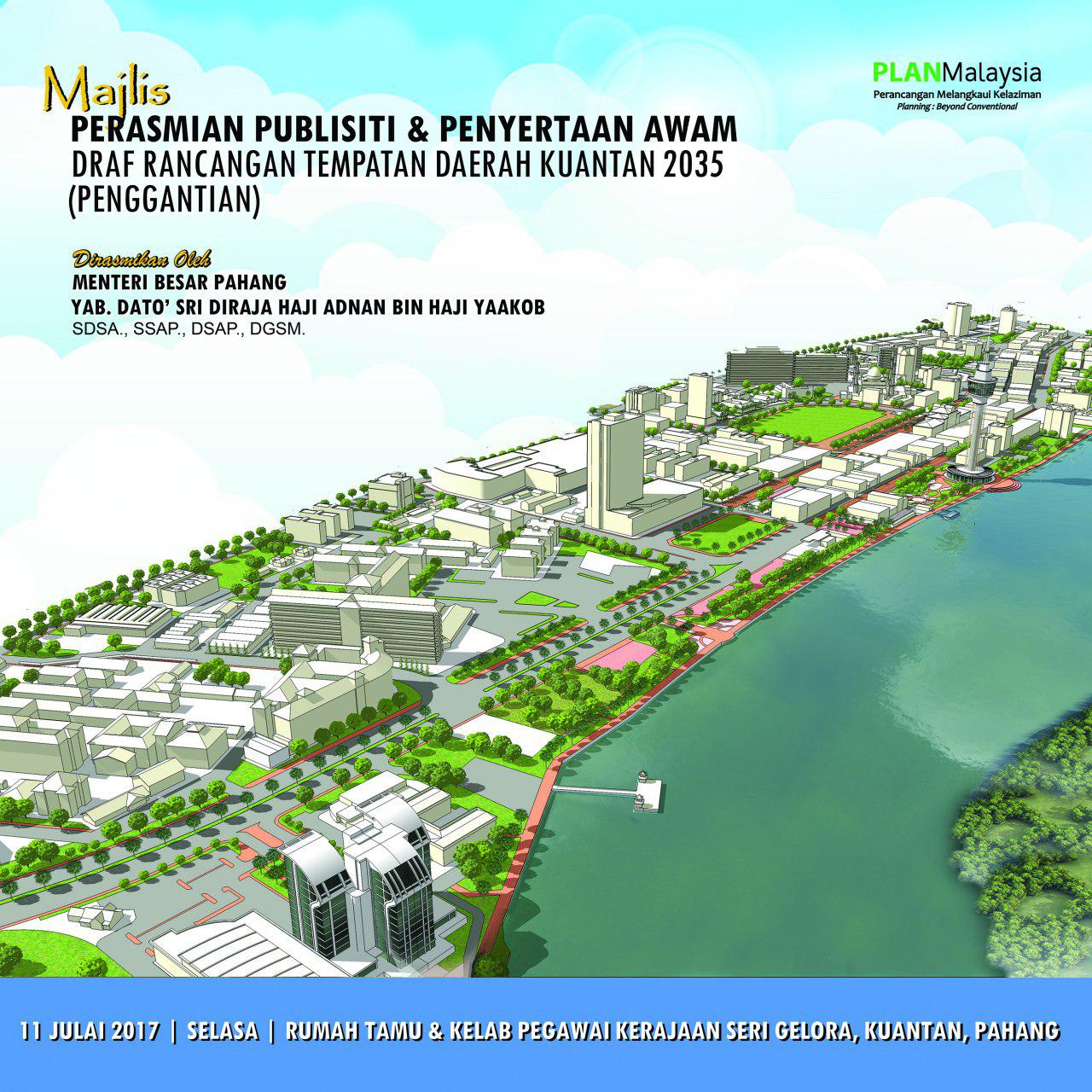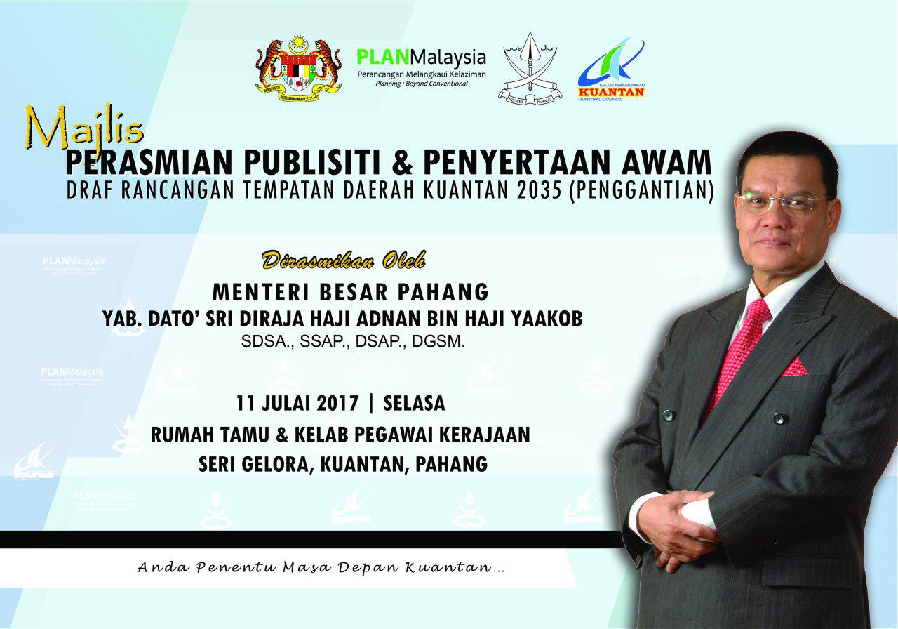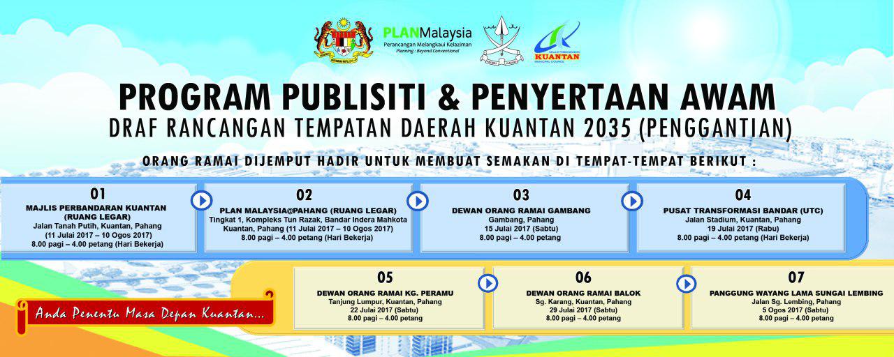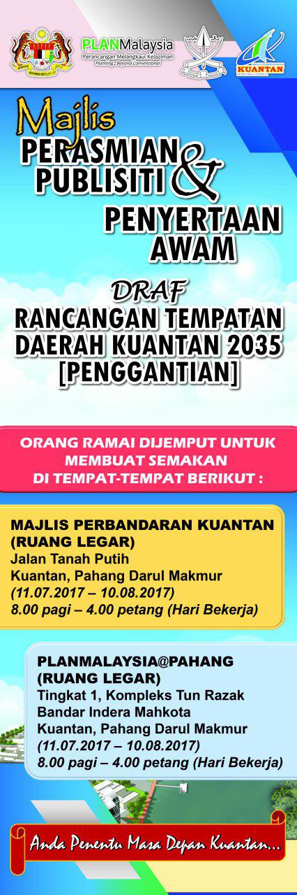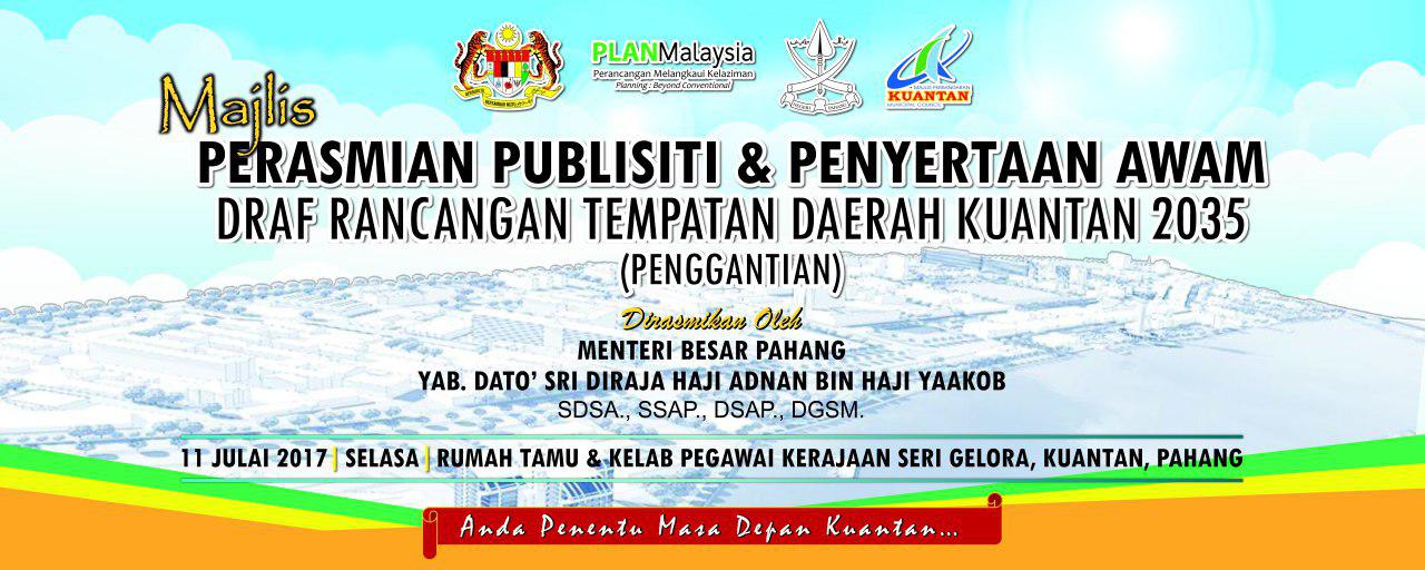 Draf Rancangan Tempatan Daerah Kuantan 2035 (Penggantian) ini disediakan dengan peruntukan Seksyen 16(1) Akta Perancangan Bandar dan Desa 1976 (Akta 172). Dokumen ini merupakan satu-satunya dokumen perancangan yang akan digunakan secara sah sebagai mekanisme perancangan Rancangan Rempatan adalah dokumen yang menyatakan semua cadangan pembangunan tanah dan fizikal yang terperinci. |